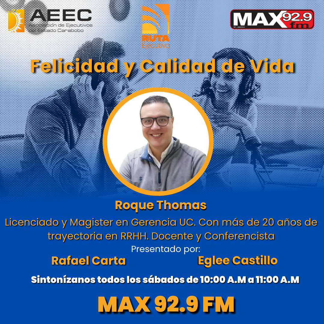 El programa “Felicidad y Calidad de Vida” de la Asociación de Ejecutivos del Estado Carabobo, con el invitado Roque Thomas, se centró en cómo la gestión personal y organizacional puede potenciar el bienestar integral y la calidad de vida, tanto en el ámbito laboral como en el personal.